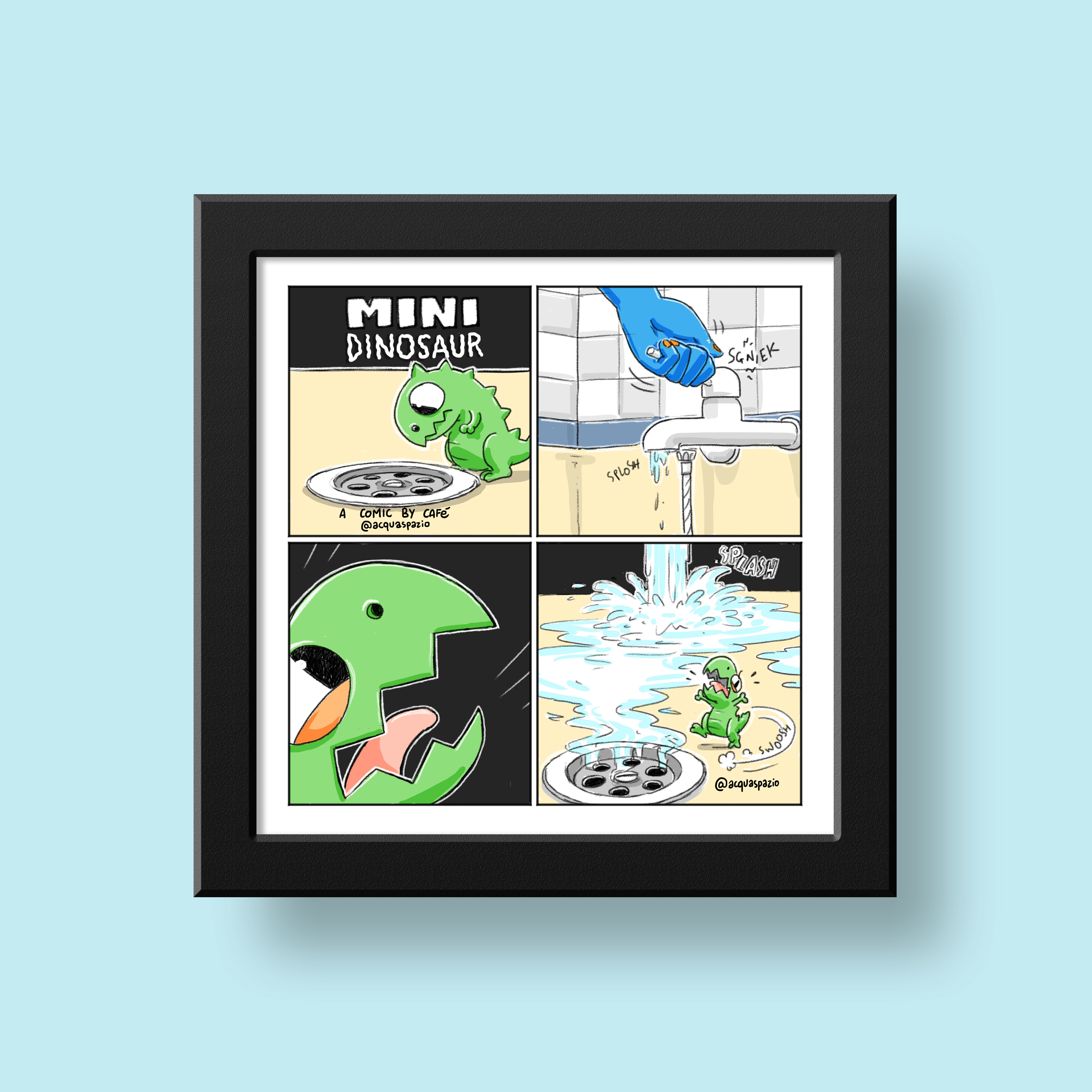 Mini Dinosaur Vs bath. print (unframed) Signed on front by the artists Printed on 300 gram carton Format: 20 cm by 20 cm