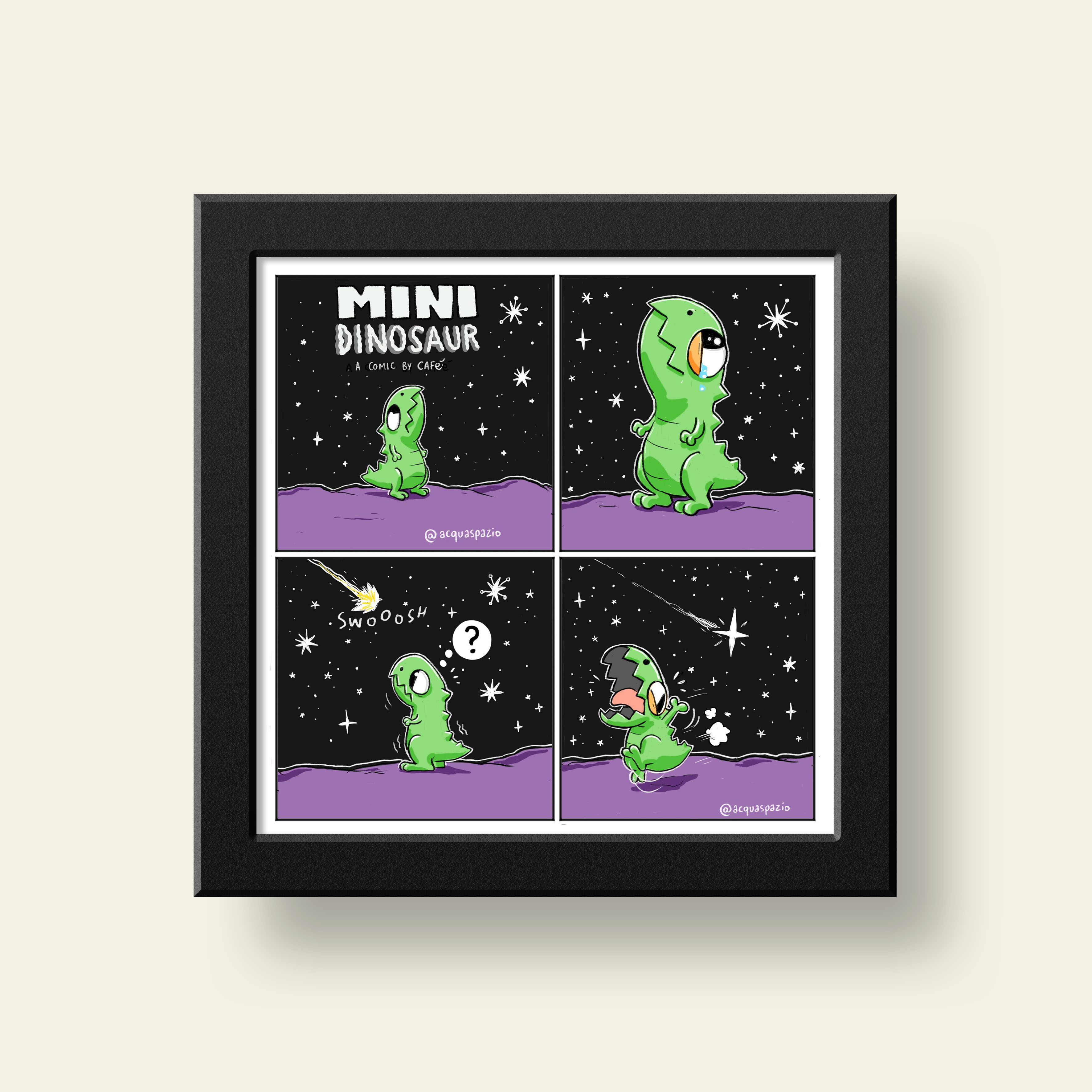 Mini dinosaur/Meteorite unframed print Signed on front by the artists Printed on 300 gram carton Format: 200 × 200 mm