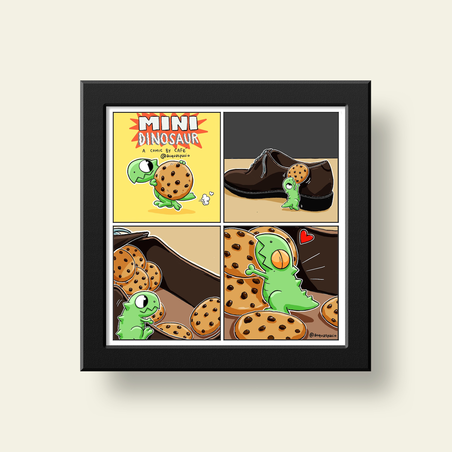 Mini dinosaur/giant Love for Cookies unframed print Signed on front by the artists Printed on 300 gram carton Format: 200 × 200 mm